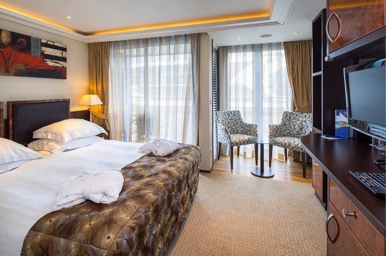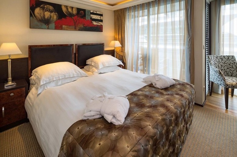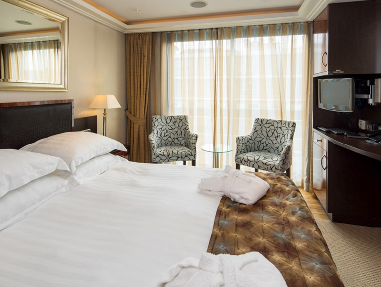 Located on the Violin and Cello Deck with a French BalconyFeatures include:   In-room temperature control Deluxe hotel-style bedding with Egyptian linen, down pillows and duvet Spacious bathrooms with multi-jet showerheads Large wardrobe, full-length mirror, hair dryer, safe and direct-dial telephone Flat-screen TV that also works as a computer Entertainment on Demand system providing complimentary TV, movies and music library Complimentary internet and Wi-Fi Complimentary bottled water replenished daily Desk and chair