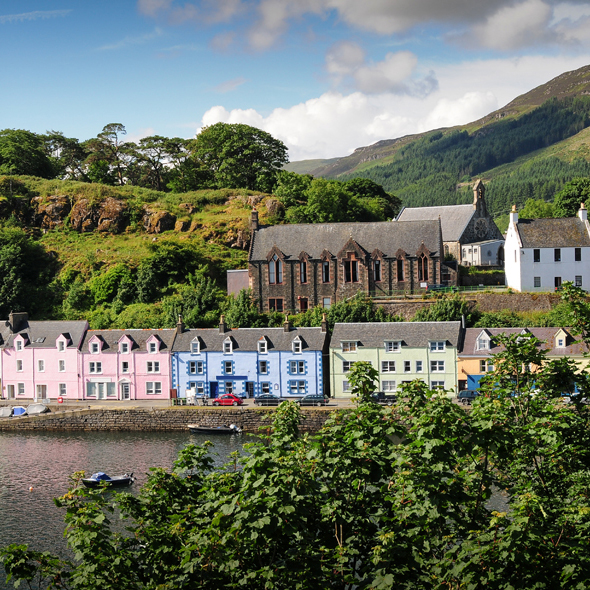Tobermory was built as a fishing port in the late 18th century and is now the main village on Mull. It is a picture-postcard of a place with the brightly painted buildings along the main street to the pier and the high wooded hills surrounding the bay. The village has a good variety of shops, hotels, and other accommodation as well as being the administrative centre for the island. The harbour is always busy with fishing boats, yachts and the ferry to and from Kilchoan during the summer months.