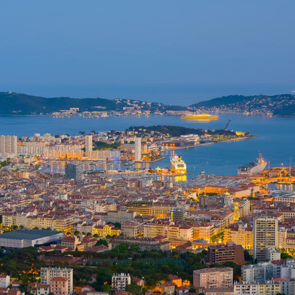 This fortress and modern town is the principal naval base of France: the headquarters of the Mediterranean fleet, with hundreds of sailors wandering the streets. With its beautiful harbor, it's surrounded by hills and crowned by forts. A large breakwater protects it on the east, and the great peninsula of Cap Sici is on the west. Separated by the breakwater, the outer roads are known as the Grande Rade and the inner roads the Petite Rade. On the outskirts is a winter resort colony. Like Marseille, the population of Toulon has grown because of the large influx of people from North Africa, especially French-speaking Algeria which was once a part of France before it broke away.
