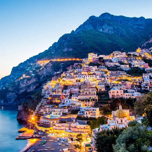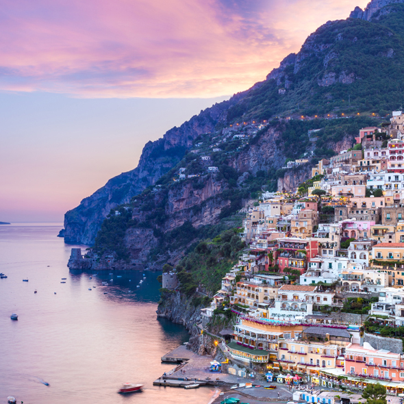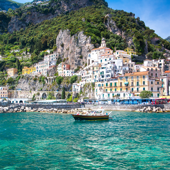 Located roughly between Salerno and Sorrento, Amalfi was already an important maritime republic in the Middle Ages. In fact, the Amalfi Tables represent the oldest maritime code in the world, which were observed throughout the Mediterranean until the late 16th century. Today, Amalfi is one of the most popular resorts and stopovers along the famed Amalfi Drive, Italy's celebrated corniche that hugs the mountainous coast and carves its way through sheer rock. Opulent villas, cloaked in brilliantly colored bougainvillea, hide behind high walls and wrought-iron gates. Waves pound against the steep shoreline and tortuous bends challenge a steady stream of tourist vehicles. Around every hairpin turn spectacular scenery awaits. Spread across the slope of the steep Lattari hills, the town itself boasts a superb setting and plenty of charm. The small, inviting center features several attractions that should not be missed. Of particular note is the duomo, also known as Cathedral Sant'Andrea, a marvel of ancient Arab-Moorish architecture. The church dominates the lively piazza, full of shops and crowded with residents and tourists at any time of day. Ruggedly beautiful and enchanting Amalfi will guarantee you a delightful introduction to Italy’s famed coastline.
