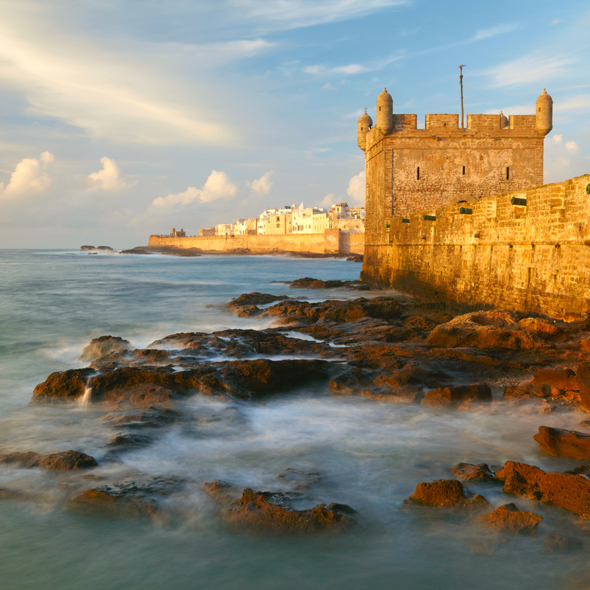 In Essaouira, a peaceful coastal town on the country's central Atlantic shores, Morocco still possesses an authentic gem, its dense mass of whitewashed houses shining brightly in contrast to the blue of sea and sky, and the blue and ochre colouring of door and window frames.