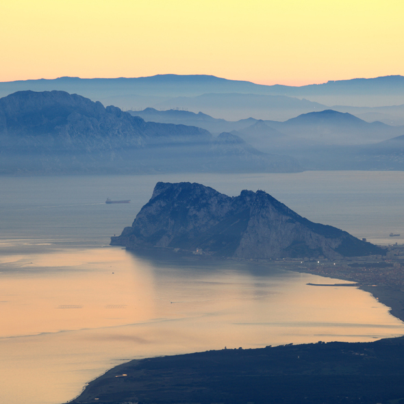 The Strait of Gibraltar is the strait which separates the Atlantic Ocean from the Mediterranean Sea. On the northern side is Spain and Gibraltar, on the southern side Morocco and Ceuta. Its boundaries were known to antiquity as the Pillars of Hercules.