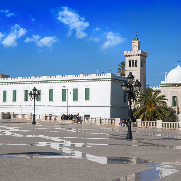Tunis is the capital of Tunisia. Situated on a large Mediterranean gulf (the Gulf of Tunis), behind the Lake of Tunis and the port of La Goulette (Halq al Wadi), the city extends along the coastal plain and the hills that surround it. At the centre of more modern development (colonial era and post) lies the old medina. Beyond this section lie the suburbs of Carthage, La Marsa, and Sidi Bou Said.