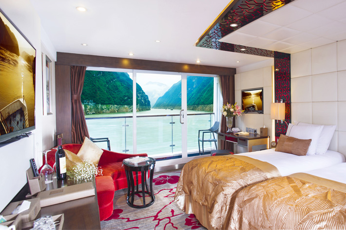 All Executive Suites feature floor-ceiling sliding doors with louvers that opening to a private balcony furnished with 2 chairs. They have 2 twin beds that can be convertible to queen size; firm mattresses with memory-foam toppers, under-bed space for suitcases, luxury bedding sets with Egyptian cotton linens, bedside tables complete with reading lamps, and a pillow menu. The en-suite bathroom comes complete with WC, sink, mirrored vanity, full shower/bathtub, luxury bath products and leads off to the lounge area where you can find a coffee table, loveseat/sofa, mirrored writing desk with chair, mirrored vanity desk with footstool and drawers and ample closet space including hangers and shelves. As well as a mini-fridge, complimentary mini-bar (local beers, soft drinks, bottled water /2 bottles PP, replenished daily), the stateroom has a hairdryer, satellite phone, alarm clock, terry bathrobes, slippers, HD flat TV (satellite reception), in-room Wi-Fi, safe, individual air-conditioning and 220V plug sockets.