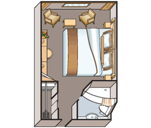 Stateroom size: 164 sq. ft. Hotel-style beds 79 inches x 63 inches (with optional twin-bed configuration) Large picture window 4.10 ft. x 2.79 ft. (can be opened) Private bathroom with shower and premium bath products Telephone, refrigerator, safe, hair dryer & bottled water replenished daily Bathrobe and slippers available upon request Air conditioning Space under bed for storing suitcases Roomy wardrobe with wooden hangers Voltage: 220V and 110V in stateroom 26-inch Sony flat-panel TV with premium entertainment package including CNN and other English-language programming