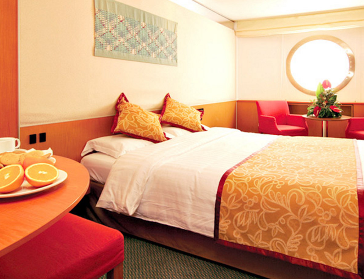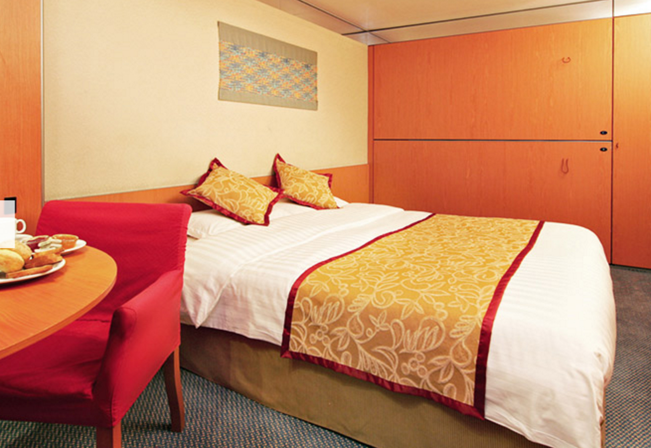 Two lower beds or queen size bed. Direct dial, ship-to-shore telephone service, television, mini-bar, hair dryer and safe deposit box in every stateroom.