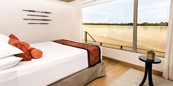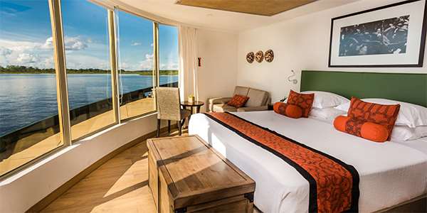 The 169-foot-long, Delfin III (formerly known as the Amazon Discovery) has been tailor made to suit its environment, while maintaining its integrity as a true luxury river cruise ship. The Delfin III offers an extraordinary level of comfort and style. The ship can accommodate a maximum of 44 cruise ship guests in 4 different styles of suites featuring floor to ceiling panoramic picture-windows. Cruise along the Amazon enjoying views of the vast rainforest full of wildlife and natural beauty from the comfort of your air-conditioned suite. This luxury river cruise ship is the perfect size to sail along the Amazon River, providing an extremely comfortable indoor and outdoor lounge, outdoor plunge pool, exercise room, spa, dining room, and sleeping accommodations.