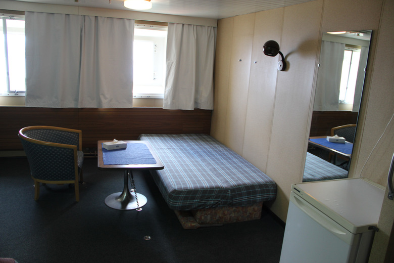 Triple cabin equipped with one lower berth, one sofa bed and one pull-down upper berth. Also equipped with opening window, writing desk and chair, private facilities, 2 wardrobes, storage box and shelving. Average cabin size 15.5f X 8.9f (4.7 m X2.7 m).