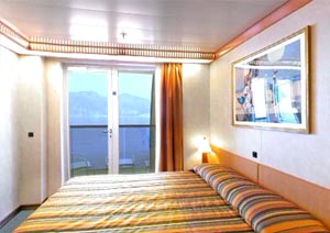 Balcony, two lower beds that can convert to queen size. Direct dial, ship-to-shore telephone service, television, hair dryer, safe deposit box and mini-bar in every stateroom.