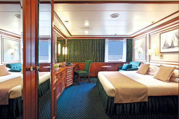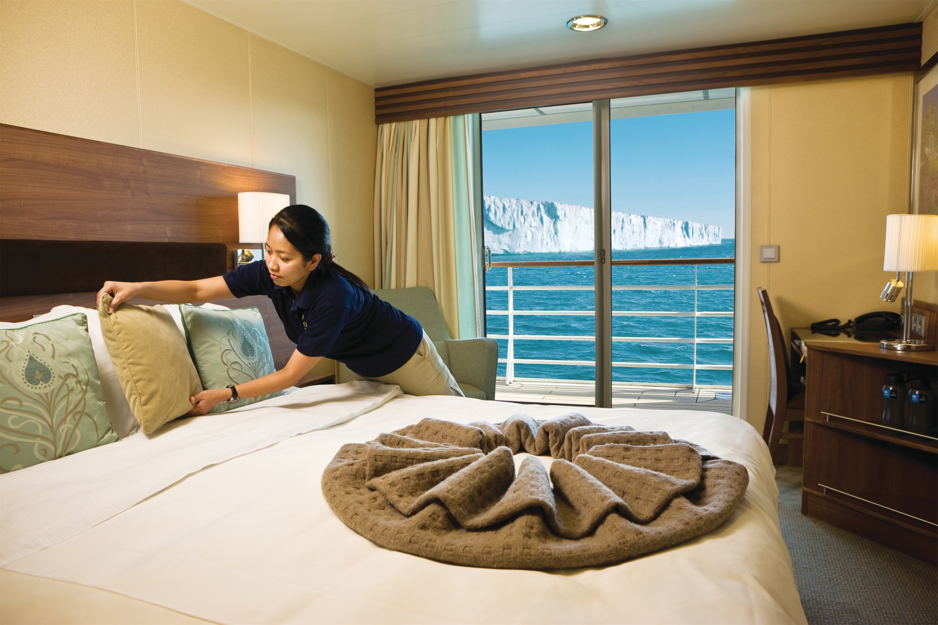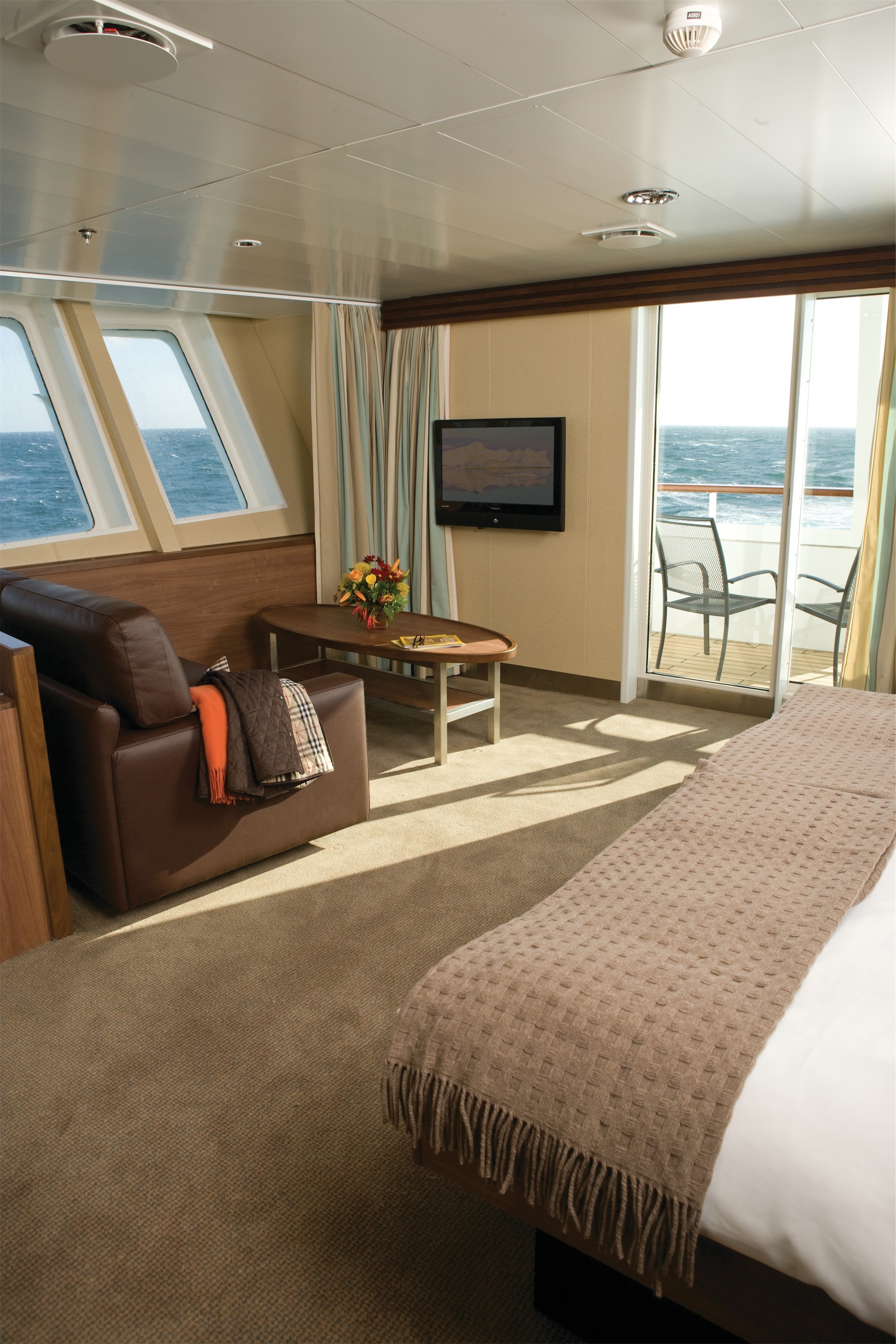 Features a private balcony or veranda with chairs, and a large sliding glass door that provides easy access and exceptional views. Individual climate control is available. Reading lamps above the bed allow for a focused beam of light to ensure your neighbour sleeps undisturbed. Each cabin has a flat screen TV. Bathrooms are also generously sized with a roomy glass-walled shower stall, and suites feature twin sinks. They are stocked with environmentally-inspired bath products and shower gel, hair dryers, and cosy white robes. Beds are cosseted in Lindblad's signature feather duvets and crisp cotton sheeting.