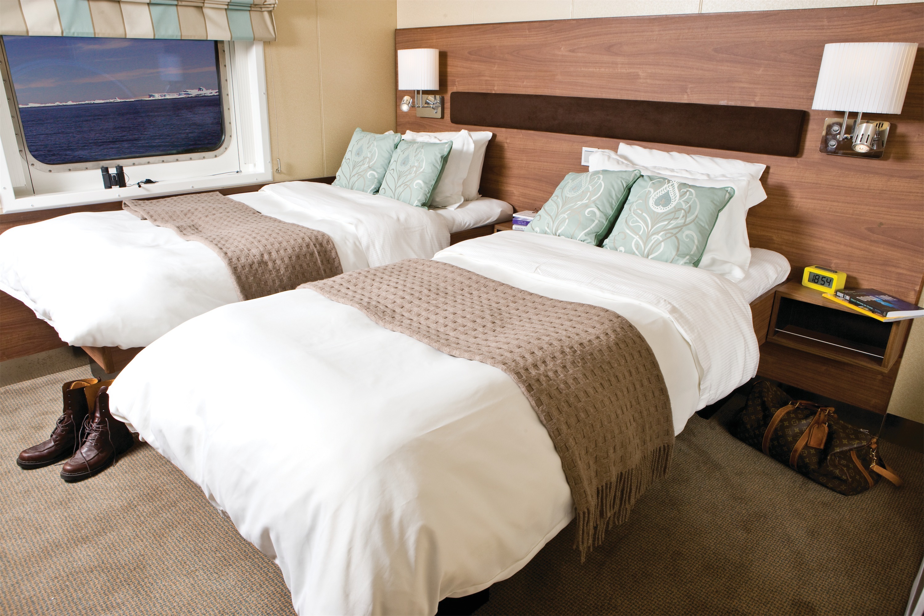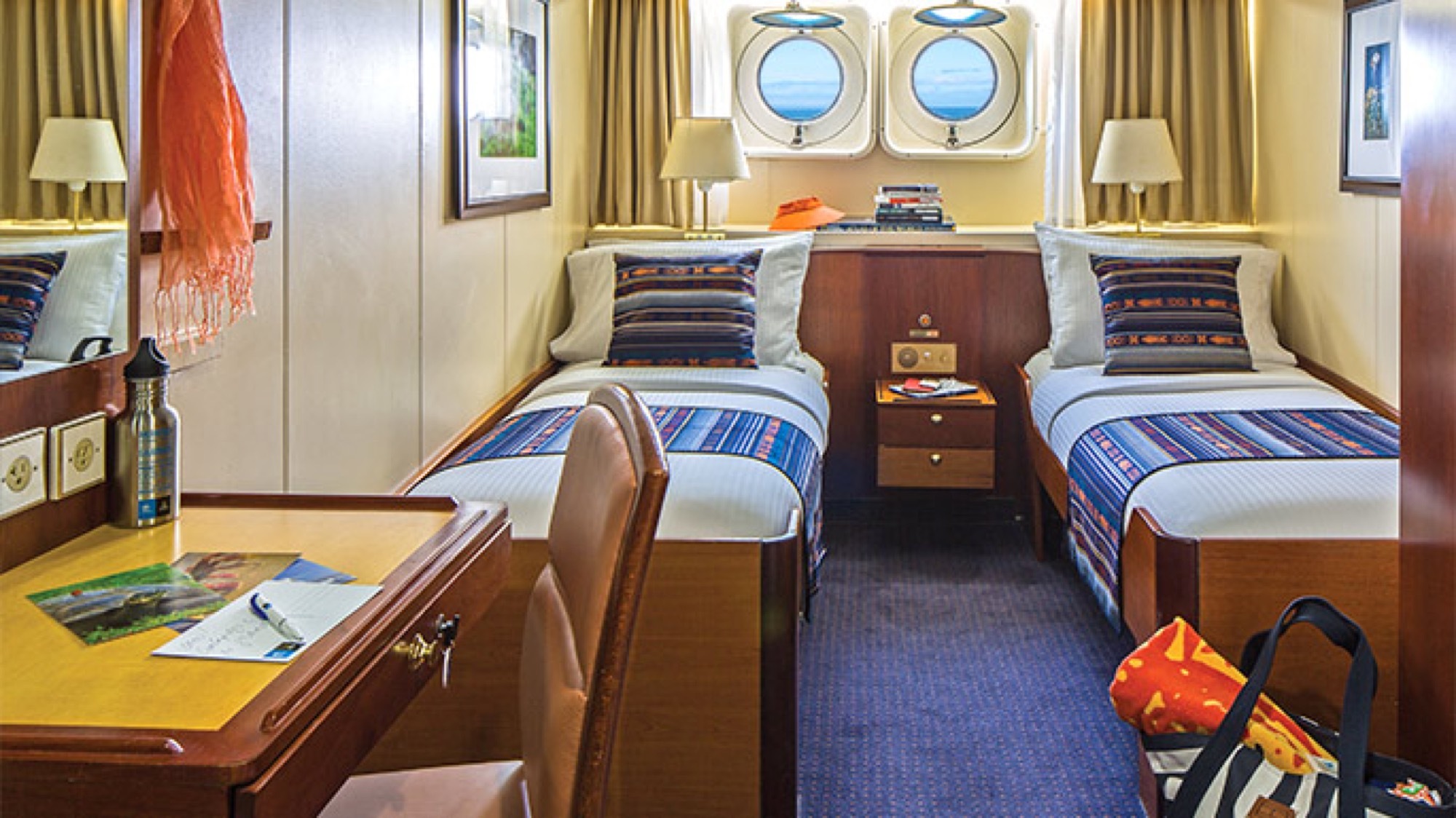 Features porthole windows that connect you with the passing views. Individual climate control is available. Reading lamps above the bed allow for a focused beam of light to ensure your neighbour sleeps undisturbed. Each cabin has a flat screen TV. Bathrooms are also generously sized with a roomy glass-walled shower stall, and suites feature twin sinks. They are stocked with environmentally-inspired bath products and shower gel, hair dryers, and cosy white robes. Beds are cosseted in Lindblad's signature feather duvets and crisp cotton sheeting.