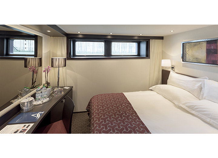 Located on the Indigo Deck (Forward & AFT) Suite features include: Comfort Collection BedsEgyptian super-combed cotton linensSoft & firm pillowsChoice of bed configurationBedside tables with reading lampsL'Occitane bath productsEasy under-bed luggage storageAlarm clockBathrobes & slippersComplimentary bottled waterIndividual climate controlLarge mirror in bathroomUSB PortsFull shower with glass doorVanity and lighted makeup mirrorLuxurious mattress toppersEuropean-style duvetsExtra blanketsNightly turn-down serviceHairdryerSpacious 3-door closets with shelves for ample storageFlatscreen satellite TV with English-speaking channels & over 100 free movie optionsDirect-dial telephoneWell-stocked minibarIn-room safeElegant, contemporary designComplimentary Wi-FiTwo windowsWriting desk and chair