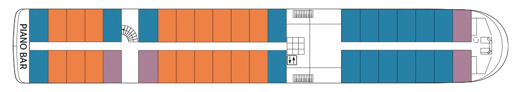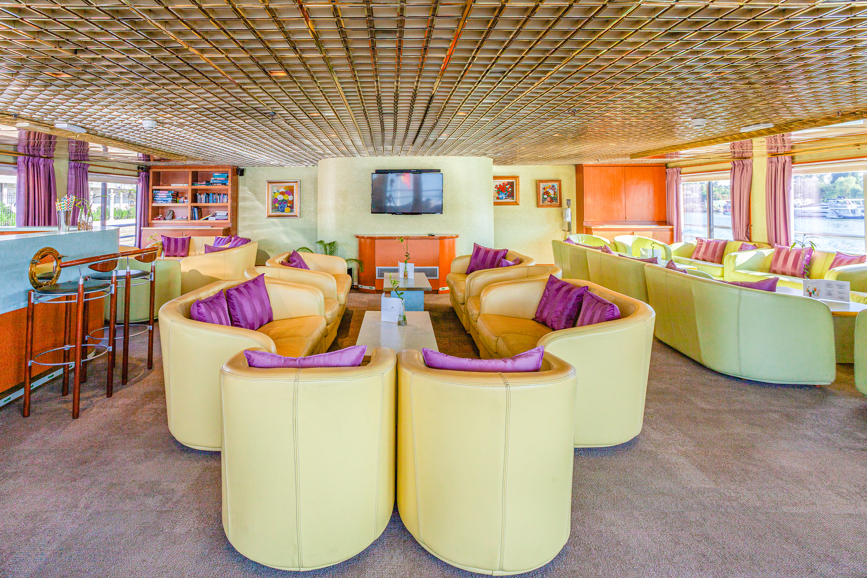 The lounge tastefully decorated, is located at the front of the ship and offers panoramic views. Cocktails and games, dancing, and other forms of entertainment all happen here.