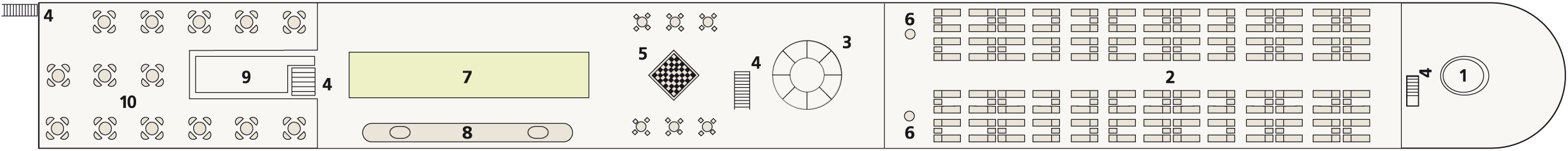 The ship's top deck features a rectangular swimming pool, complete with a shower and a large sunbathing area with loungers.