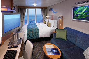 Two twin beds (can convert into queen-size), sitting area (some with sofa bed), private balcony, mini bar, private bathroom, vanity area, hair-dryer, closed-circuit TV and phone. Rates vary from deck to deck. Also referred to as Deluxe Ocean View Stateroom with Balcony. (204 sq. ft., balcony 41 sq. ft.)