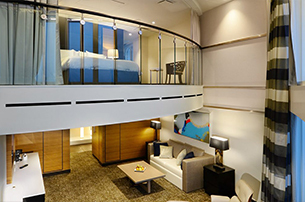 Two bedrooms with twin beds that convert to queen-size beds (one room with third and fourth Pullman beds), two bathrooms (one with shower, one with bathtub), living area with double sofa bed, private balcony, and concierge service. (533-586 sq. ft., balcony 139-193 sq. ft.) Stateroom can accommodate up to 8 guests.