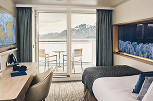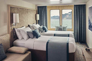 All cabins are outward-facing and feature large windows. All are equipped with climate control, an expedition command center—including tablets, multiple electrical and USB outlets, a TV, barometer, a National Geographic Atlas, and more—a mini refrigerator, small safe, and robes. Bathrooms are outfitted with a rain shower and directional showerhead, botanically inspired products, and a hair dryer. Enjoy luxury linens and pillows, as well as complimentary insulated water bottles.