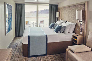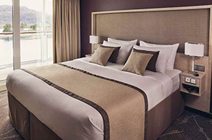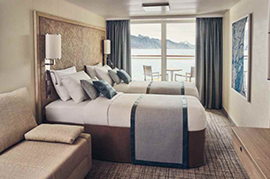 #406, 408, 411, 413, 415 — Fore Deck, with two large windows, two singles that can convert to a queen, armchair, writing desk and chair, two bedside tables, window sofa, and a closet.