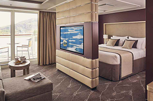 #710 — Junior suite with balcony that features two balcony chairs, hammock, and a table; two single beds that convert to a queen convertible sleeper sofa, writing desk with chair, two bedside tables, and a closet.