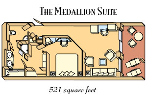 A mark of distinction - Sumptuous and spacious with rich textures and panoramic views surround you with distinguished luxury.Guests can expect a teak veranda with patio furniture and floor-to-ceiling glass doors, a large living room complete with convertible sofa to accommodate an additional guest as well as a separate dining area.Fitted with twin beds or queen-sized bed, Medallion Suites have a marbled bathroom with double vanity, full-sized bath, separate shower, a walk-in wardrobe with personal safe is provided along with a Radio/alarm with iPod docking station, direct-dial telephone and a refrigerator and bar setup, stocked with your preferences. Pratesi® fine bed linens and down duvet covers, premium mattresses and a choice of pillows, Plush robes and slippers, choice of European bath amenities, vanity table(s) with hair dryer, writing desk(s) with personalised stationery, binoculars, and umbrella, WiFi access, Flat screen TV(s), on-demand movies, and satellite news, and dry cleaning and pressing service (fee applies).