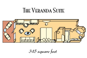 The Midship Veranda Suite offers preferred central location with identical accommodation to a Veranda Suite. Some Midship Veranda Suites accommodate three guests.