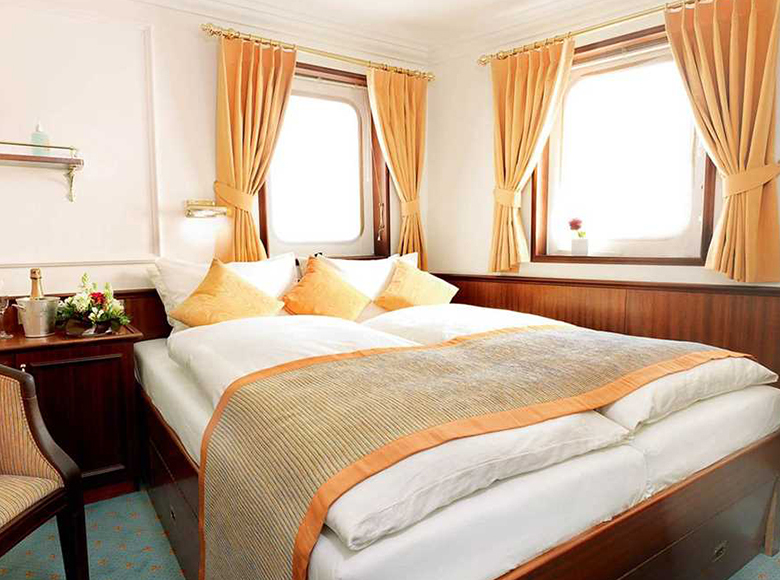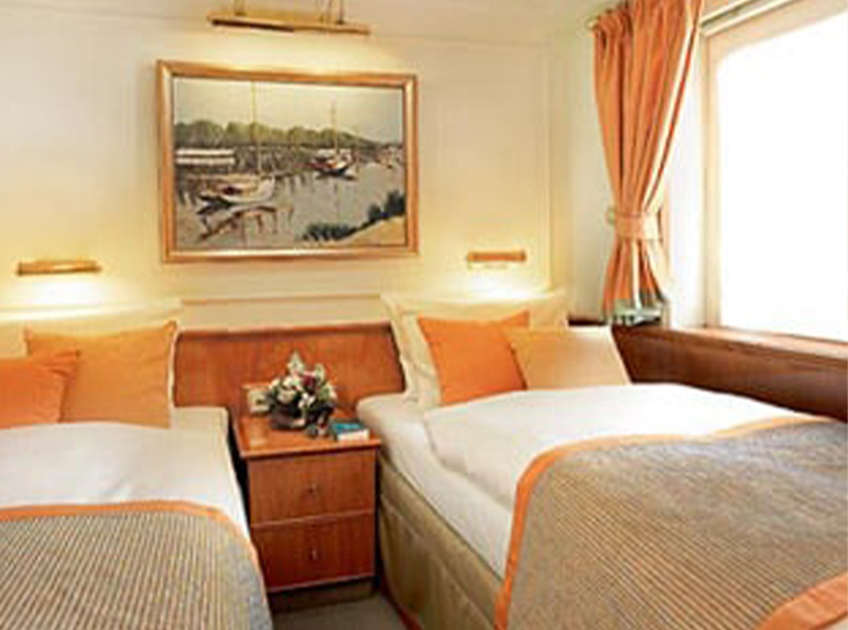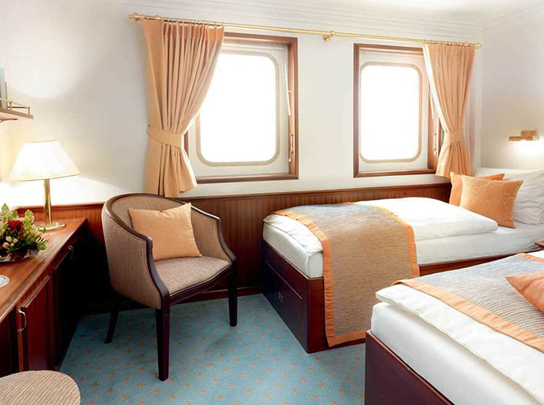 #18-25 — These cabins have two single beds, panorama window, dressing table, and efficient bathrooms with showers, marble sink, and gold-plated fixtures. They have telephones, temperature controls, a minibar, and a small safe.
