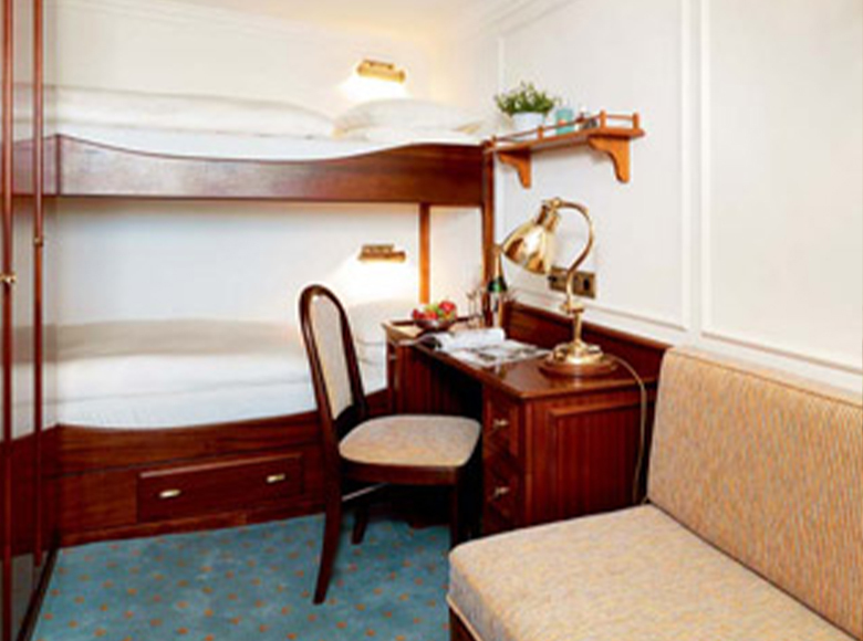 #16-17 — These solo cabins feature single beds and a window; they once housed the ship’s officers. They are equipped with temperature controls and a minibar. Ice is delivered twice daily. Each cabin is equipped with a telephone, small sofa, and small safe. Bathrooms feature