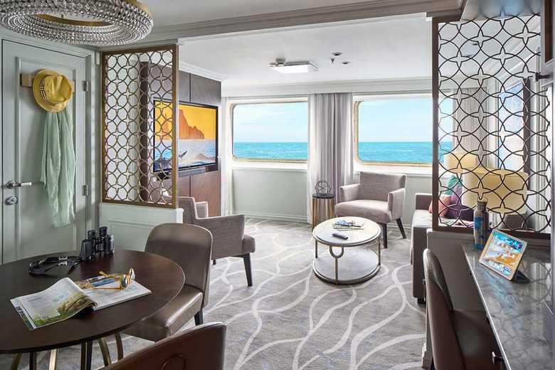 These 515 sq. ft. Islander Suites feature four panoramic windows, twin beds that can convert to a king, separate living area with sofa, table and chairs, two lounge chairs, espresso maker, and larger bathroom with rain shower and soaking tub. Both suites are available for triple occupancy with the sofa converted into a bed. Guests receive a welcome amenity, complimentary laundry, and priority access to one spa appointment per departure.