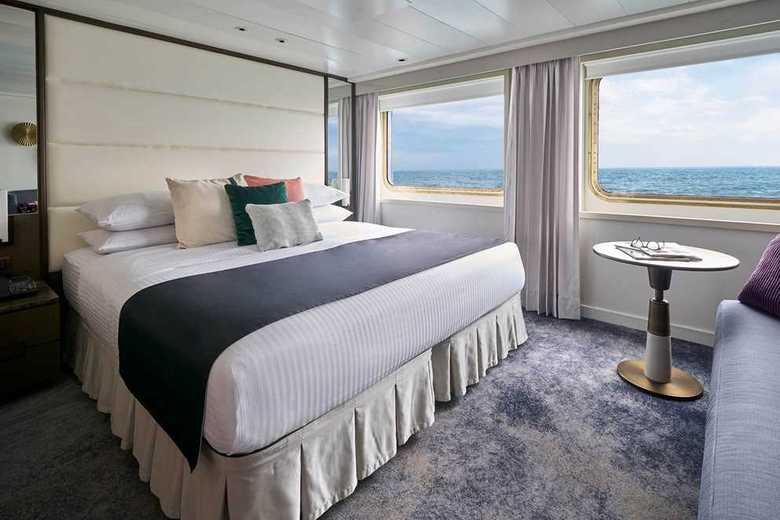 280 sq. ft. with two panoramic windows, twin/king convertible beds, seating area with sofa, lounge chair, and marble double-sink bathrooms with rain shower.