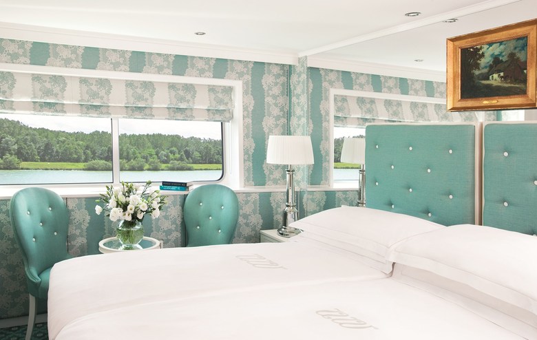 Lavishly appointed riverview stateroom (151 sq ft - 14 sq m) with a French balconyHandcrafted Savoir® Beds of England, built-in closet, hair dryer, safe, individual thermostat, flat-screen TV with infotainment center and satelliteMarble bathroom with Asprey bath and body products, plush towels, heated mirror, backlit magnifying mirror, comfortable bathrobes and slippers