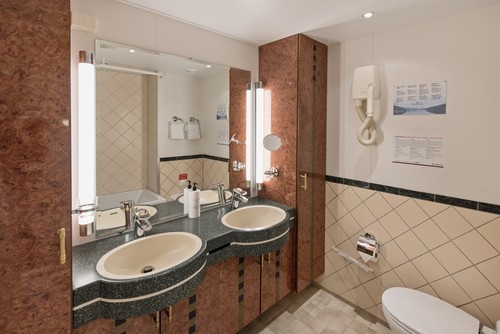 The ship is beautifully appointed and decorated in the Art Deco style that was modern when the first ship with this name was built. Rich colours, bold geometric shapes and lavish ornamentation characteristic of the Art Deco style. She is the only ship with both a swimming pool and Jacuzzi∘ on deck. A defining feature on the MS Finnmarken is her bow; from deck 5 you can actually go all the way to the tip.