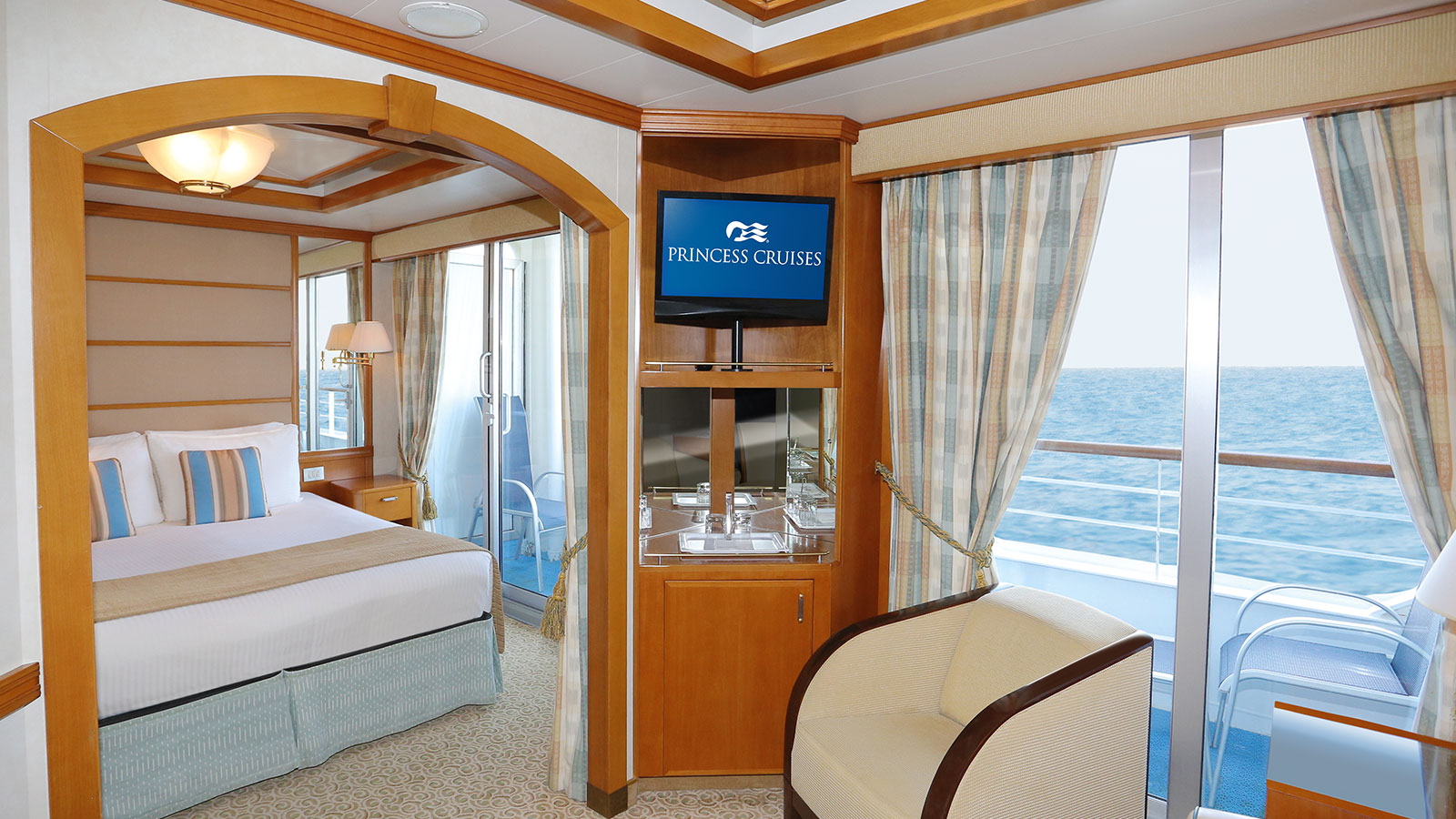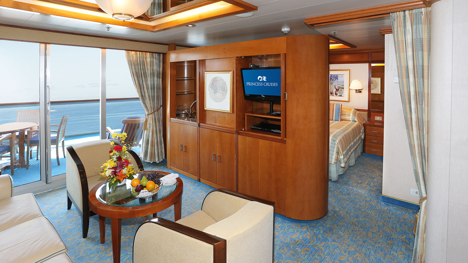 Suite staterooms include a spacious cabin and large balcony with room for four with two comfortable loungers, a table and two chairs. They also feature special suite-only benefits, such as a separate seating area with a sofa or sofa bed, walk-in closet, full bathroom with deluxe amenities including Complimentary mini-bar set-up, CD/DVD player with access to a complimentary DVD library, personal safe, Comfortable luxury pillow-top mattress, A luxurious queen-size bed, 100% Egyptian cotton linens, Upgraded bathroom amenities and hair dryer, Two flat-panel satellite TVs, Evening bed turn-down, chocolates on your pillow, Refrigerator, Writing desk and phone, 110V, 60-cycle alternating current (AC) with standard U.S. plug fittings, Daily housekeeping service and enhanced nightly turn-down service.