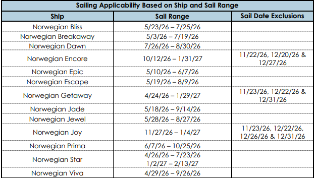 - Offer is subject to change at any time per Norwegian Cruise Line's discretion. Other restrictions may apply.