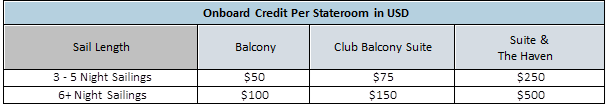 - Onboard credit offer is per stateroom, in U.S. Dollars and will be applied to 1st and 2nd guest on the reservation.